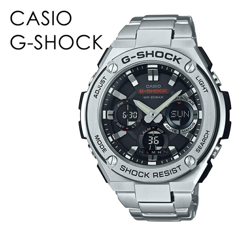 型番 GST-W110D-1A9JF ケース材質:ステンレススティールサイズ約:縦59×横52mm重さ約:195gベルト材質:ステンレススティールベルト腕周り最少:15cmベルト腕周り最大:21cmムーブメントクォーツ(電池式)機能留め金:中留三ツ折れワンプッシュ式タイプ風防素材:ミネラルガラス耐衝撃構造タフソーラー(ソーラー充電システム)電波受信機能:自動受信(最大6回/日)(中国電波は最大5回/日)/手動受信 針退避機能ワールドタイム:世界48都市(31タイムゾーン、サマータイム設定機能)+UTC(協定世界時)の時刻表示、ホームタイムの都市入替機能ストップウォッチ機能(1/100秒、60分間計、スプリット)タイマー(セット単位:1秒、最大セット:100分、1秒単位で計測)時刻アラーム5本(カウントダウン機能)・時報バッテリーインジケーター表示パワーセービング機能12/24時間制表示切替操作音ON/OFF切替機能フルオートダブルLEDライト:文字板用LEDライト(残照機能、残照時間切替(1.5秒/3秒))、LCD部用LEDバックライト(残照機能、残照時間切替(1.5秒/3秒))防水機能防水性:20気圧防水付属品casio専用BOX保証書取扱説明書